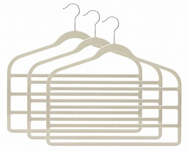Whether they're your heaviest jeans or your dressiest slacks, they won't slip off the velvety-soft surface of this ultra-slim hanger! Each hanger holds four pairs of slacks, and takes up less space in your closet or garment bag than a typical plastic hanger (just 1⁄4" thick; 18" wide). Sold in packs of (3) hangers. 18" Wide Ultra Slim Design Sold in sets of (3).The Slim-Line Linen Multi Pant Hanger is a must-have for anyone looking for a sleek and efficient way to store their pants. Its slim design not only saves space but also adds a touch of sophistication to your closet or display. So why settle for traditional hangers when you can upgrade to these multi-use and stylish pant hangers? Grab your pack of three today and experience the convenience and organization you never knew you needed!